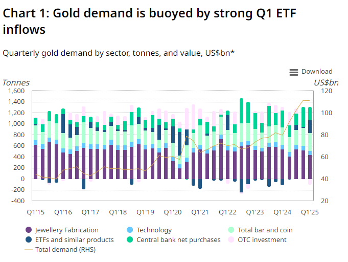 关税政策助推避险潮,全球一季度黄金需求创历史新高,ETF流入激增推动金价飙升。