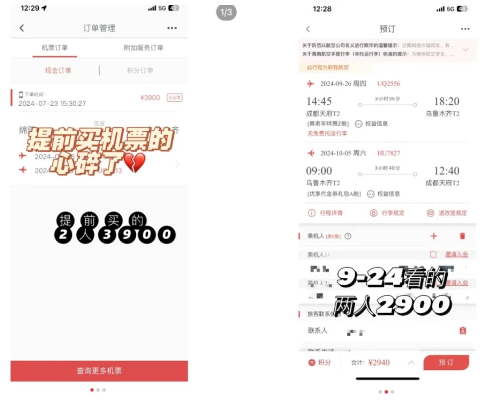 在社交平台上,不少旅客发帖反馈,提前一两个月下单国庆节机票,结果节前一段时间查看票价,发现价格出现大幅下滑。