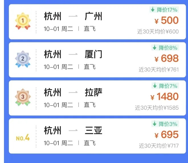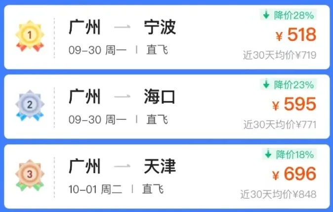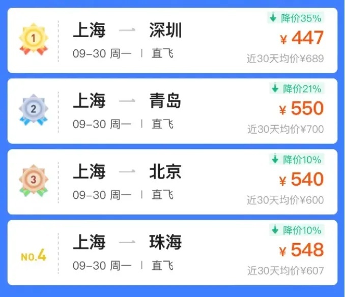 不仅如此,记者查询发现,不少热门城市国庆假期去程机票,都有不同程度的跳水。9月30日从上海出发到深圳、青岛等城市均有不同程度的价格跳水。